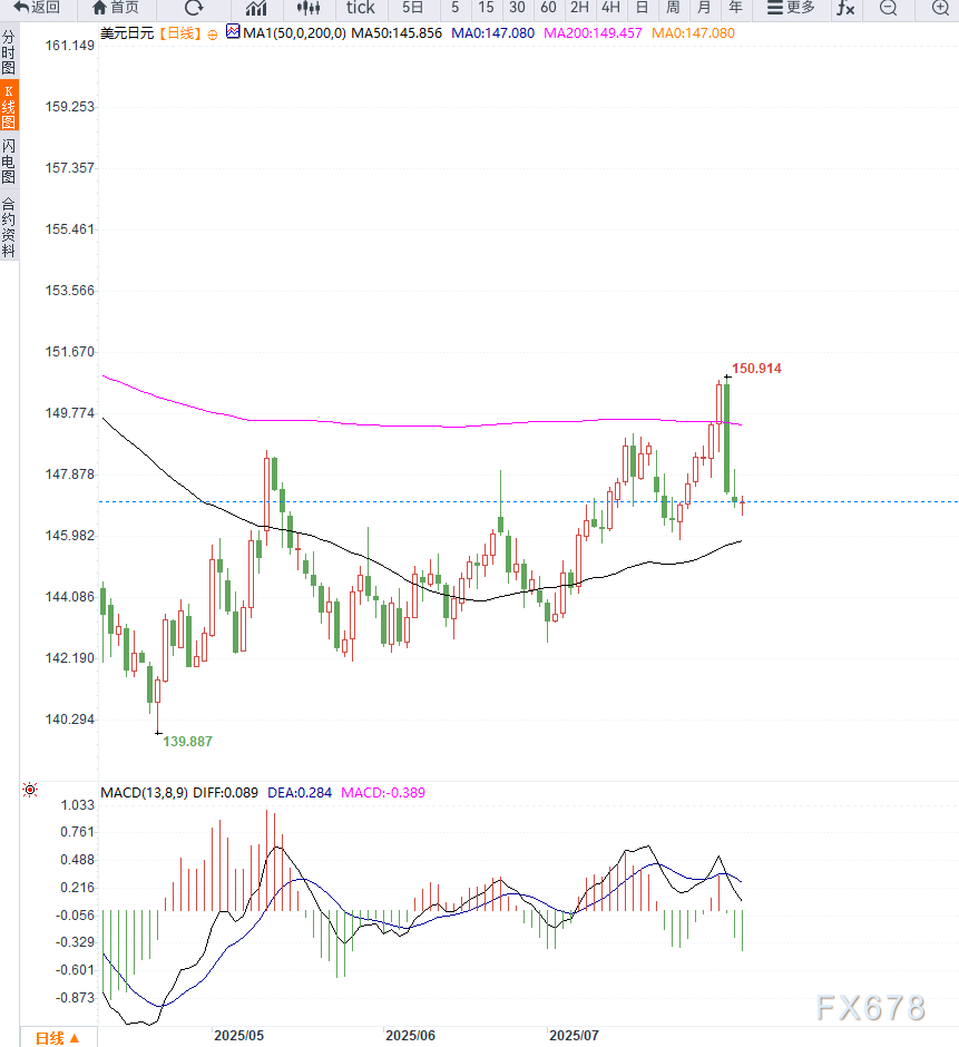 日线图上,美元兑日元在从7月低点反弹后回落至147关口附近,在50%斐波那契回撤位146.85上方获得支撑,并短线企稳。若汇价突破147.35及147.75(38.2%回撤位)区域,则有望挑战148.00整数关口,一旦站稳,短期底部结构将确立,或吸引更多买盘介入。